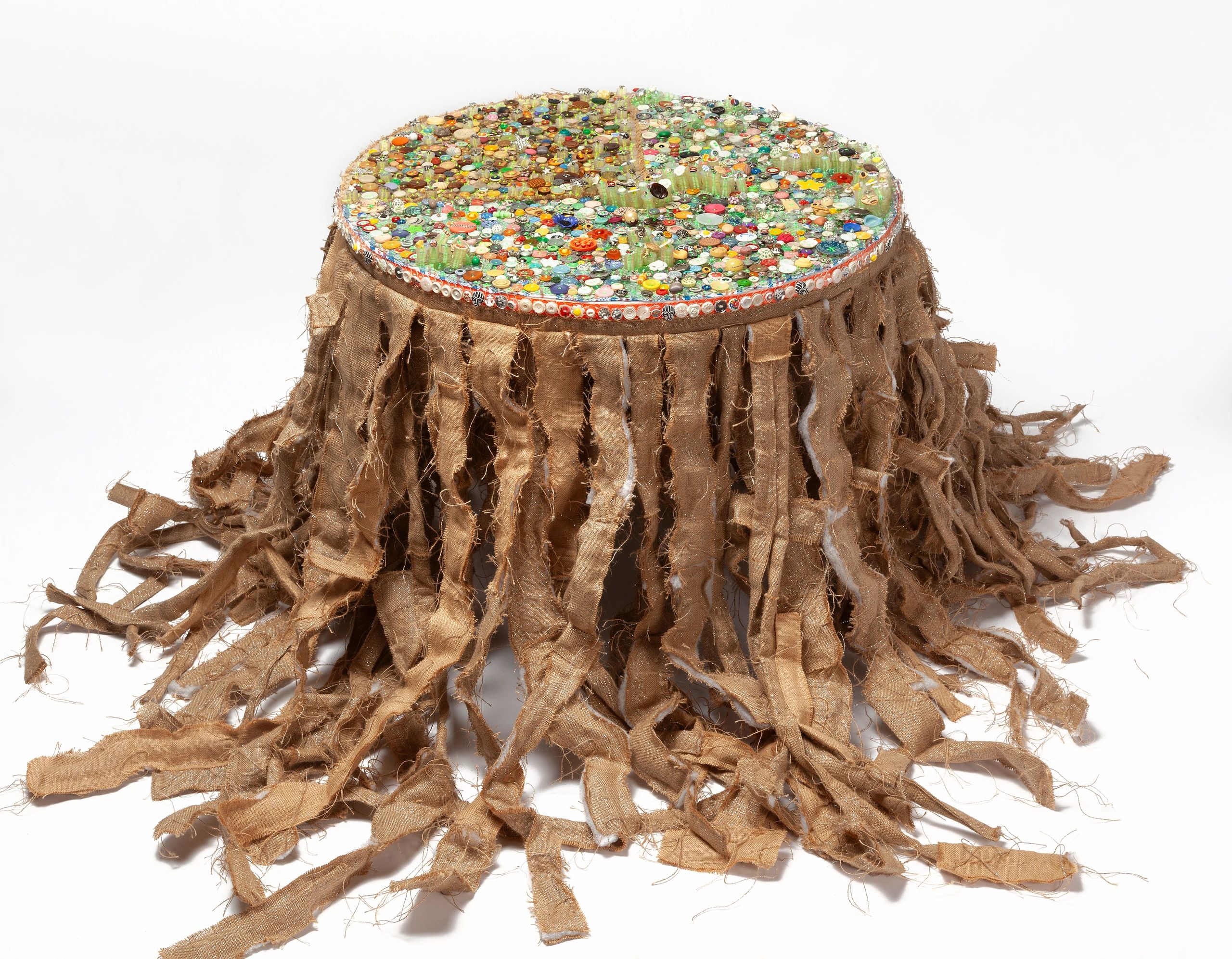 Beau McCall, The Conversation, 2017-2023. Assorted clothing buttons (cloth, metal, bone, et al.), embroidery thread, burlap, plastic bags, 34 x 36 x 36 in. (table) total dimensions variable.