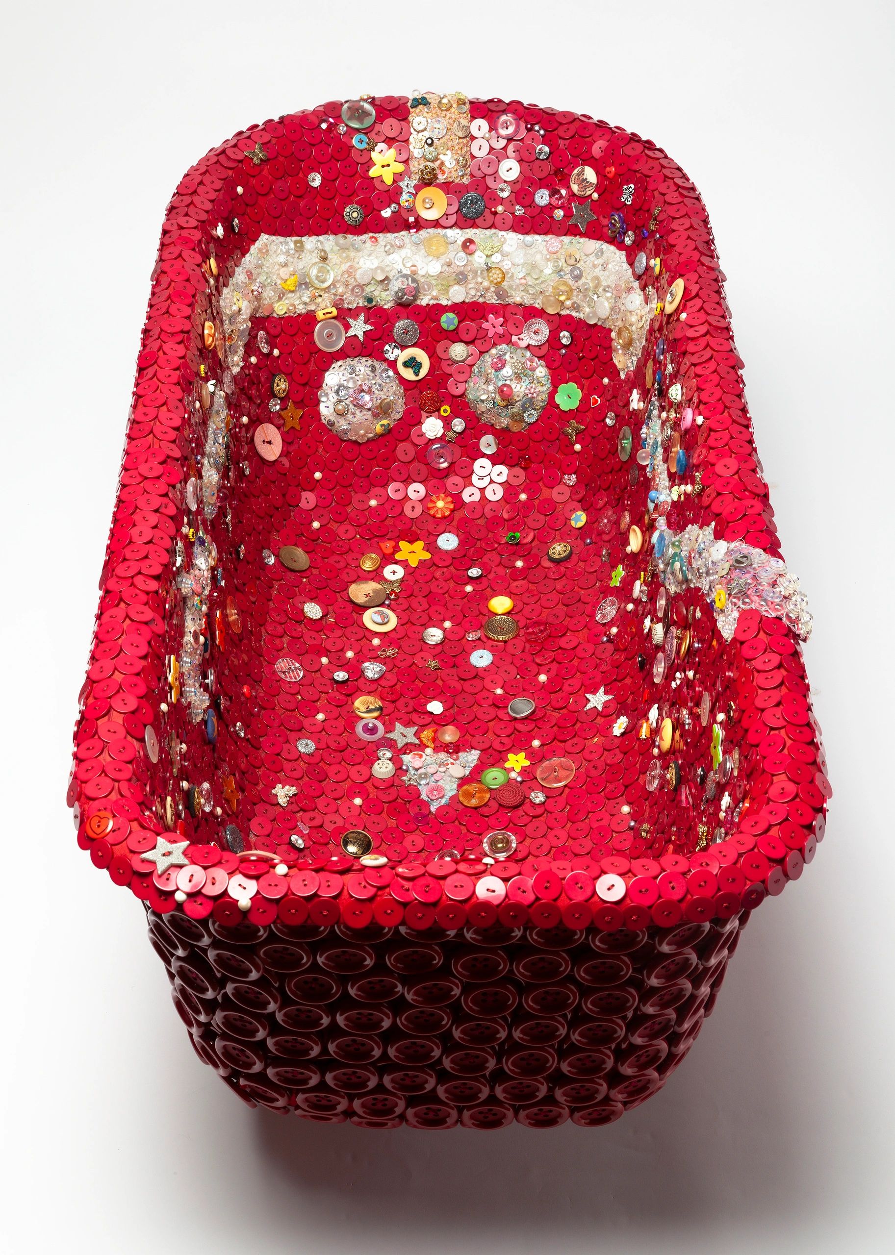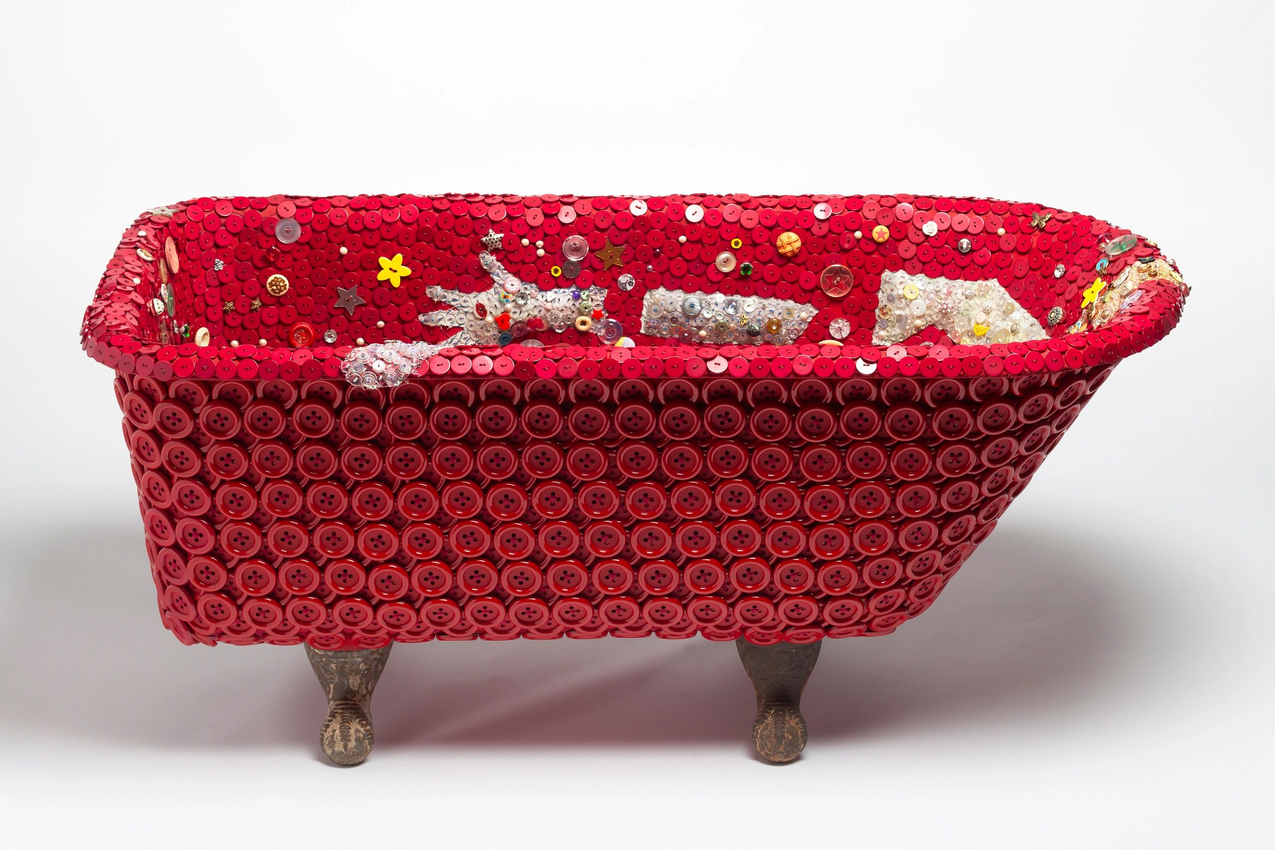 redpotionno.1, 2014. Assorted clothing buttons (mother-of-pearl, rhinestone, cloth, et al.), embroidery thread, cotton fabric, cast iron tub, 53 x 17 x 23 in.