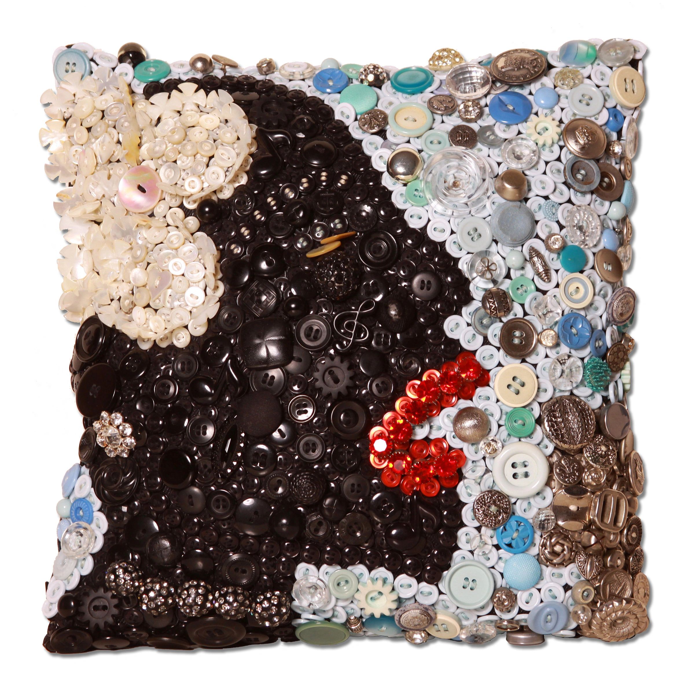 Beau McCall, Button Pillow: Lady Day, circa 1995. Assorted clothing buttons (mother-of-pearl, metal, rhinestone, et al.), embroidery thread, upcycled pillow, 13 x 12 x 2 in.