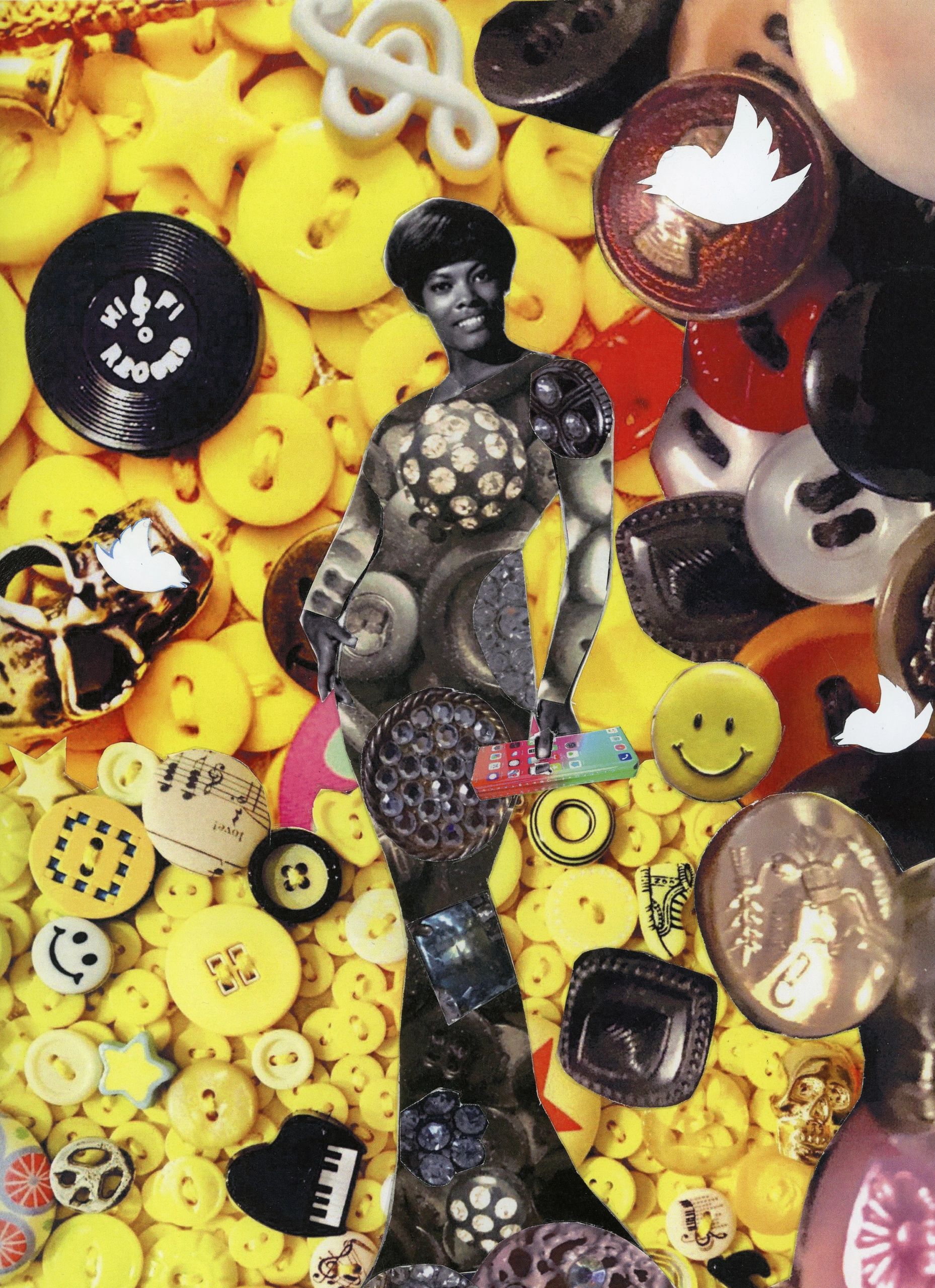 Beau McCall references the witty and sassy tweets of Ms. Warwick, which brought joy to her followers, made her a viral sensation, and helped her connect with an intergenerational social media audience. The collages combine close-up photos from McCall’s button embellished and hand-sewn visual and wearable art with a range of photos and clippings.